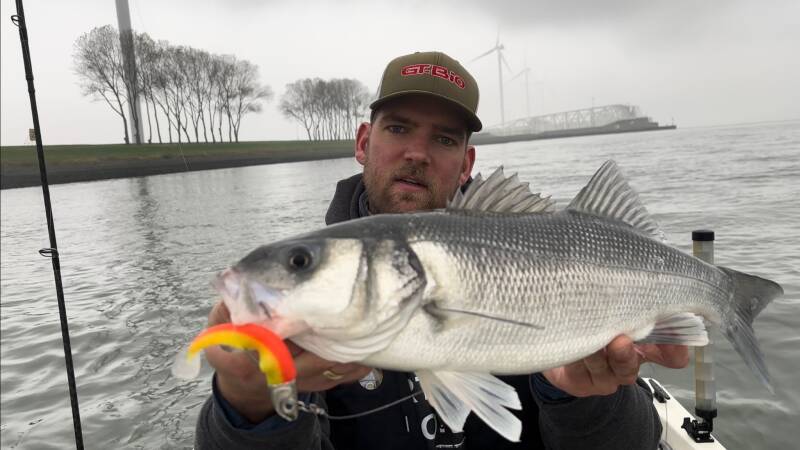 31 mei 2025 de eerste zeebaars van 65cm gevangen met de GT-BIO Roller Shad in de kleur orange yellow.